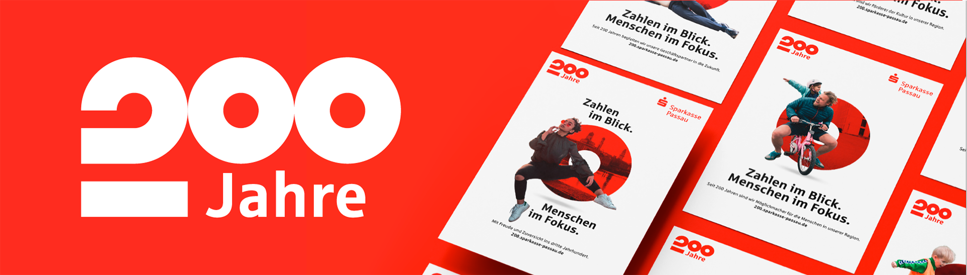 „200 Jahre Sparkasse Passau“ – Erscheinungsbild und Kampagne drehen sich um Menschen. Menschen mit unterschiedlichen Hintergründen, wie die Kunden und Mitarbeiter der Bank. Im Leitmotiv mit wechselnden Personen stehen sie im Mittelpunkt. Vertraute Orte im Hintergrund erzeugen ein Gefühl von Heimat als gemeinsame Vergangenheit und Ort der Zukunft. Die Kernbotschaft der Kampagne definierte die Sparkasse in den letzten 200 Jahren: „Zahlen im Blick. Menschen im Fokus“. Die Zahl „200“ verleiht dem Jubiläumslogo Stabilität und Dynamik zugleich. Der Punkt über dem Sparkassen-„S“ wird zur runden Form mit zusätzlichen Funktionen: Eine Linse für den Focus. Eine Projektionsfläche für Orte. Ein Fernglas für Weitsicht. Die Jubiläums-Kampagne umfasst eine Vielzahl aufeinander abgestimmter Einzelmaßnahmen: Vom Magazin bis zur Außenwerbung, vom Veranstaltungsevent bis zur Social-Media-Kampagne. Eine Kampagne mit hohem Integrations- und Identifikationspotenzial.