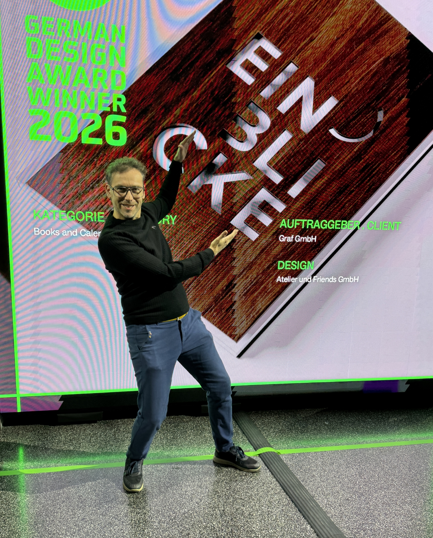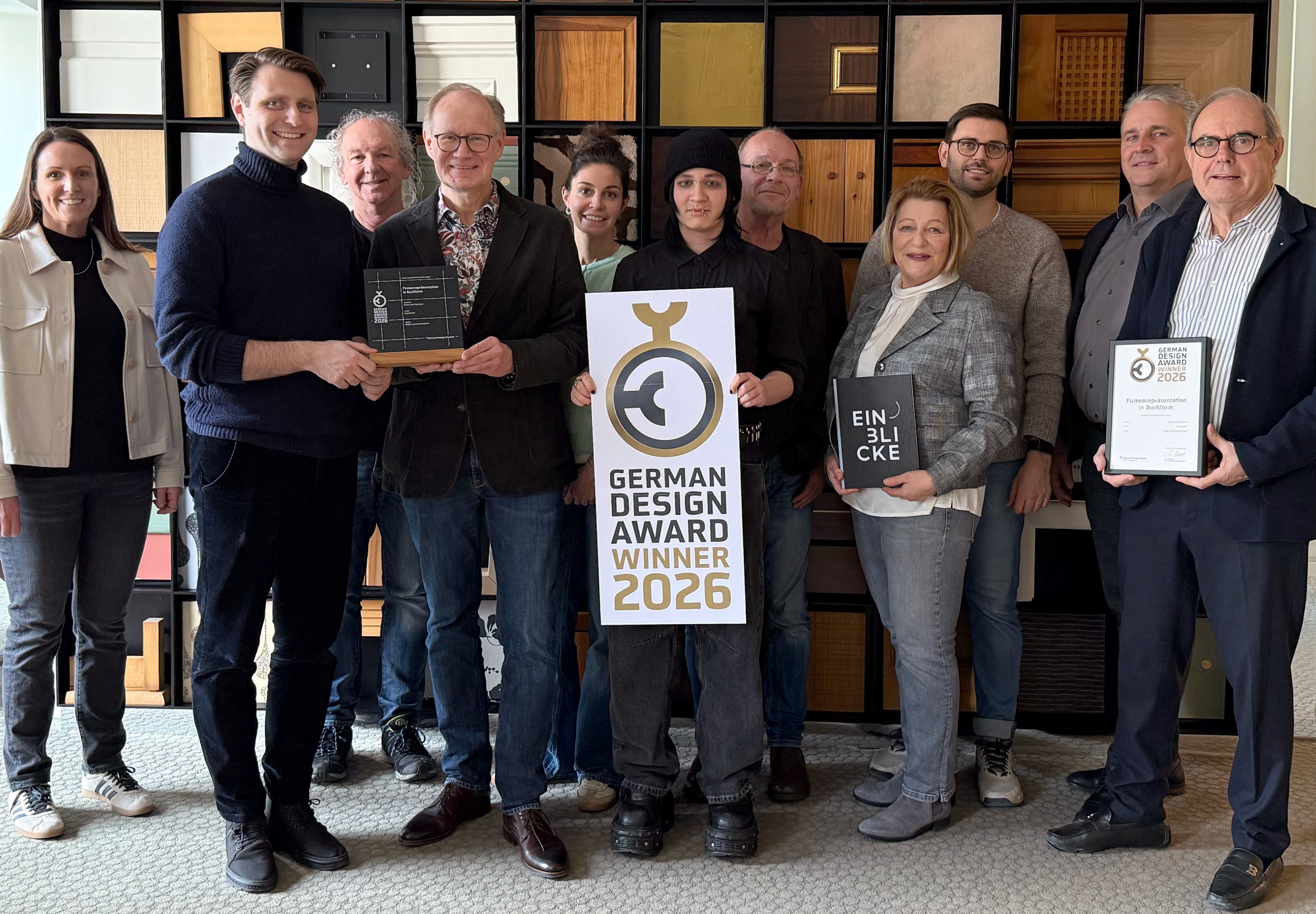 Ein Buch mit einem Titelblatt aus Holz, aus dem die Buchstaben eines Wortes herausgefräst sind. Öffnet man das Buch, wirft der Buchdeckel seinen Schatten auf die andere Seite. Dort bildet sich jetzt, sozusagen aus Licht geschrieben, der Titel ab: „Einblicke“ heißt das Buch, das die Firma Graf aus Zenting anlässlich ihres 70-jährigen Bestehens gestalten ließ. Das 172-Seiten starke Werk, das auch für den Generationenwechsel im Familienunternehmen steht, macht nun Furore: Die damit beauftragte Design- und Kommunikationsagentur Atelier und Friends wurde dafür mit dem German Design Award 2026 ausgezeichnet. Bei der Preisverleihung am 6. Februar in Frankfurt am Main holte sie damit den Titel „Winner“ in der Kommunikationsdisziplin „Books and Calendars“.