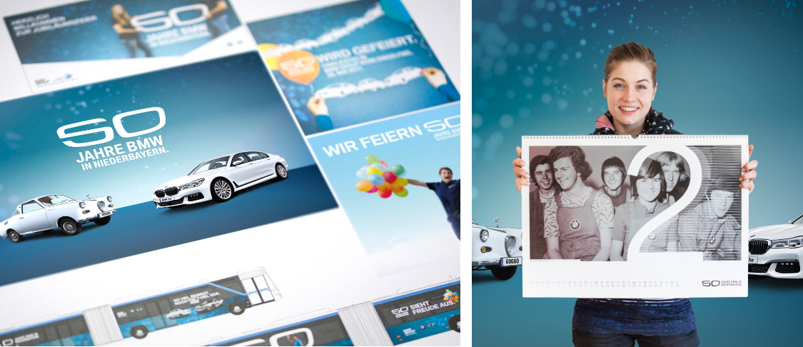 Das 50-jährige Jubiläum des größten Arbeitgebers in Niederbayern war den BMW Group Werken ein eigenes Branding wert. Die an die legendären „BMW-Nieren“ erinnernde 50 wurde zentraler Bestandteil der Kommunikation in Form von Großflächen, Anzeigen, Publikationen, Jahreskalender u. v. m. Darüber hinaus begleiteten wir zahlreiche Festveranstaltungen, Familientage und Publikumsevents über das gesamte Jubiläumsjahr hindurch. Das eigenständige Branding würdigt damit auch Niederbayern als Standort, der auf eine äußerst erfolgreiche gemeinsame Entwicklung zurückblicken kann.