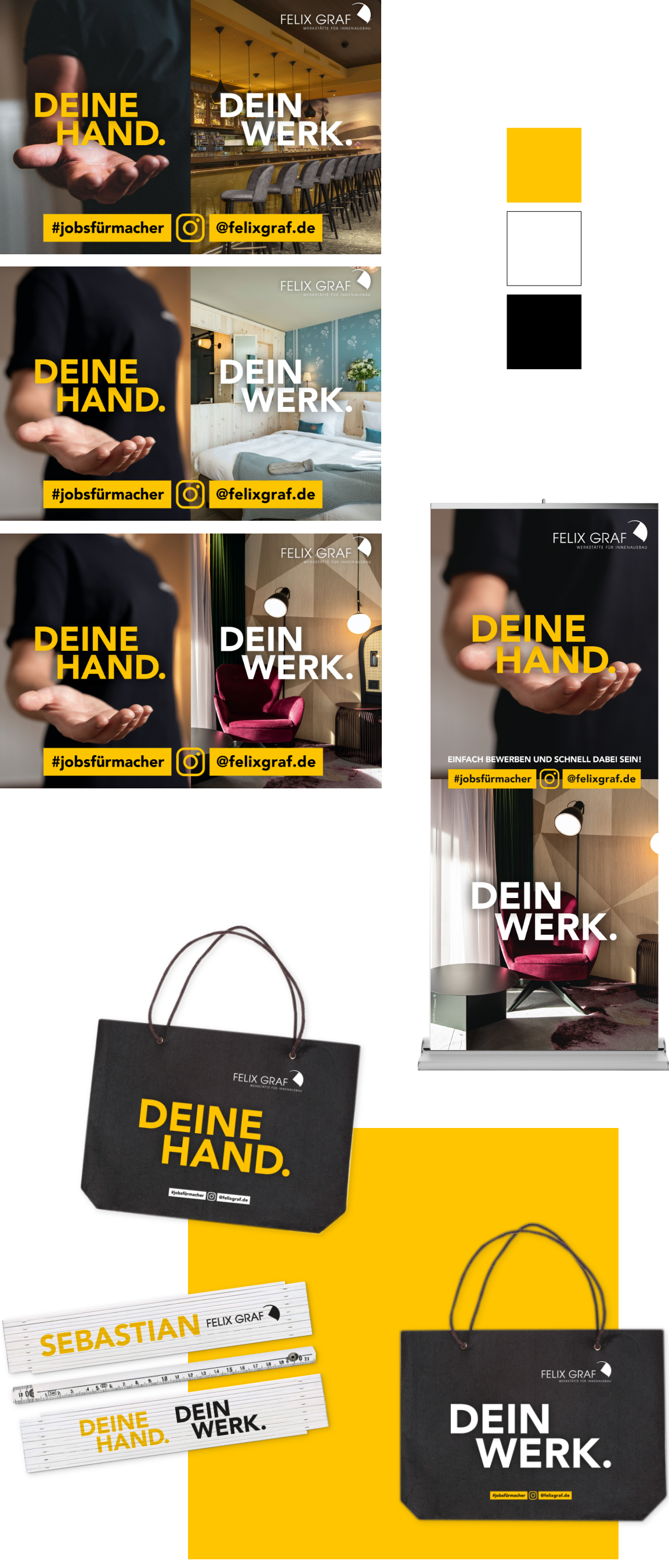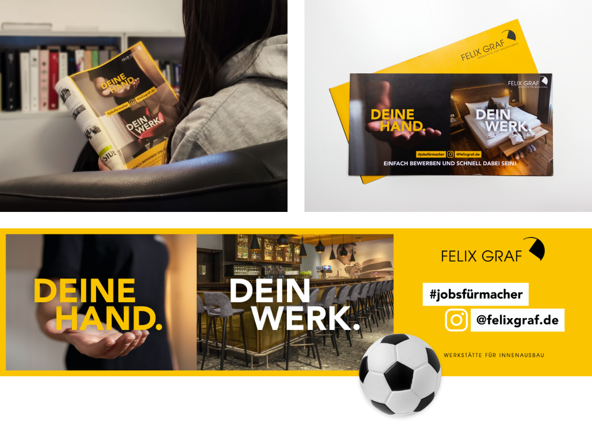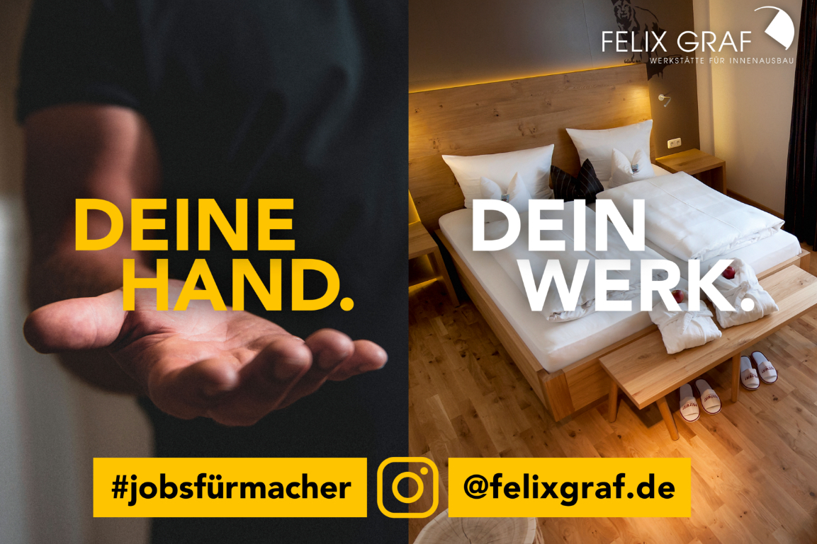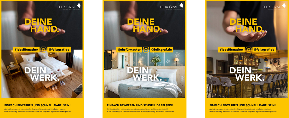 Der Hoteleinrichter Felix Graf GmbH ist ein typischer „hidden Champion“: International renommiert, daheim eher weniger bekannt. Die permanente Suche nach qualifizierten Arbeitskräften konzentriert sich bevorzugt auf das regionale Umfeld. Deshalb hat die Employer Branding-Kampagne zwei vorrangige Ziele, kurzfristig Bewerbungen zu generieren und in der Weiterführung langfristig die Arbeitgeber-Marke zu stärken. Handwerksaffine potenzielle Bewerber werden auf unterschiedlichen, miteinander verschränkten Kanälen direkt angesprochen: Großflächen, Anzeigen, Facebook- und Instagram-Werbung. Aktionen an Schulen/Hochschulen sorgen für persönliche Kontakte und Give aways an Bewerber für nachhaltige Wirkung. Ein eigener Bereich auf der Homepage erlaubt unkomplizierte Online-Bewerbungen. Strategisches Employer-Branding ist die Antwort auf zunehmendem Facharbeitermangel.