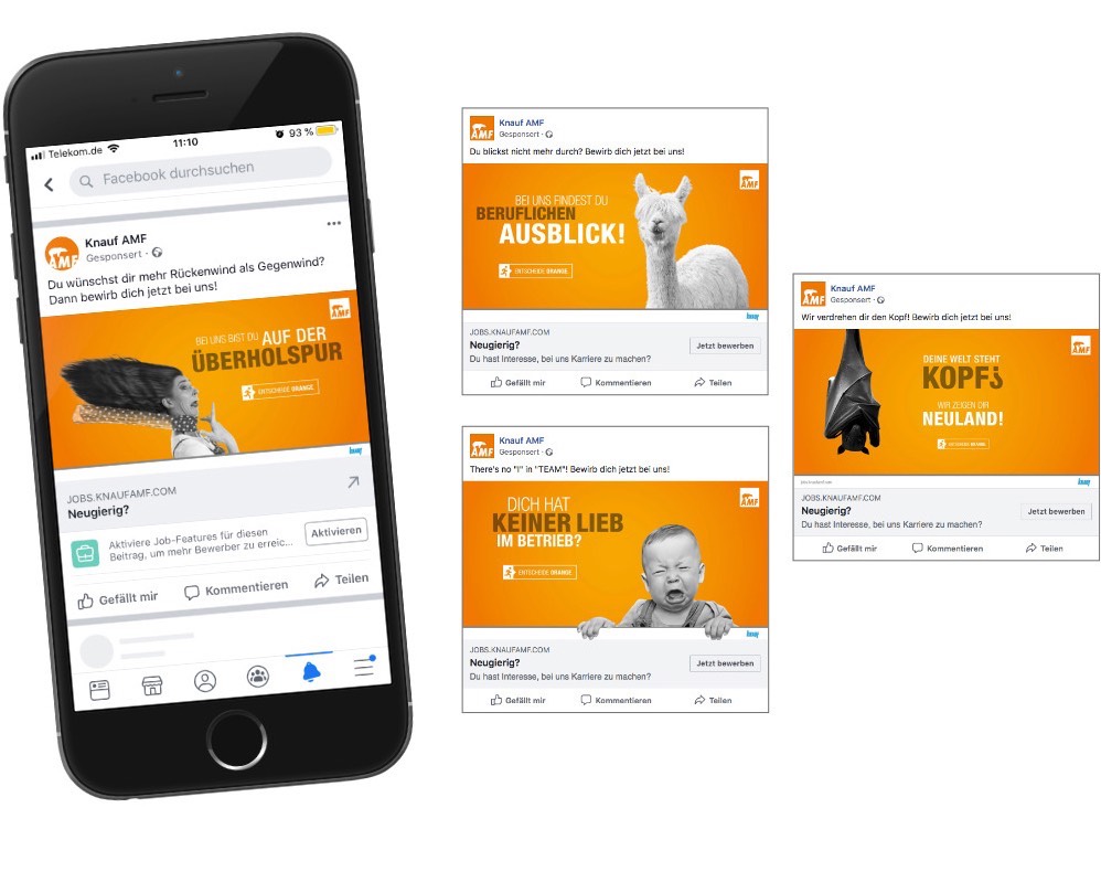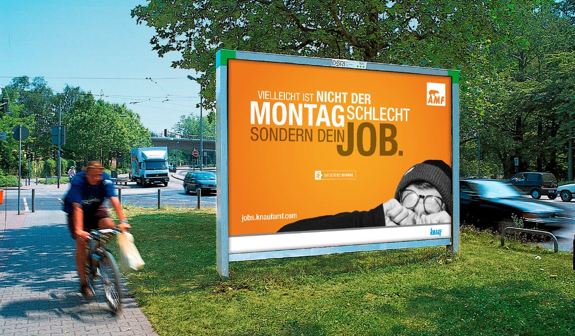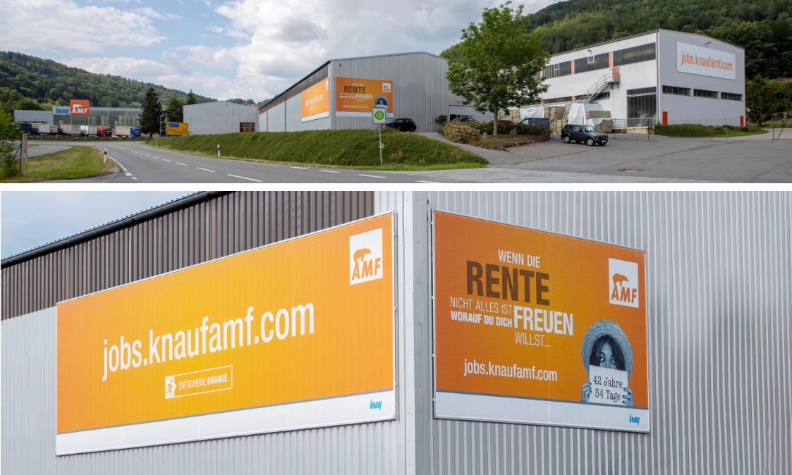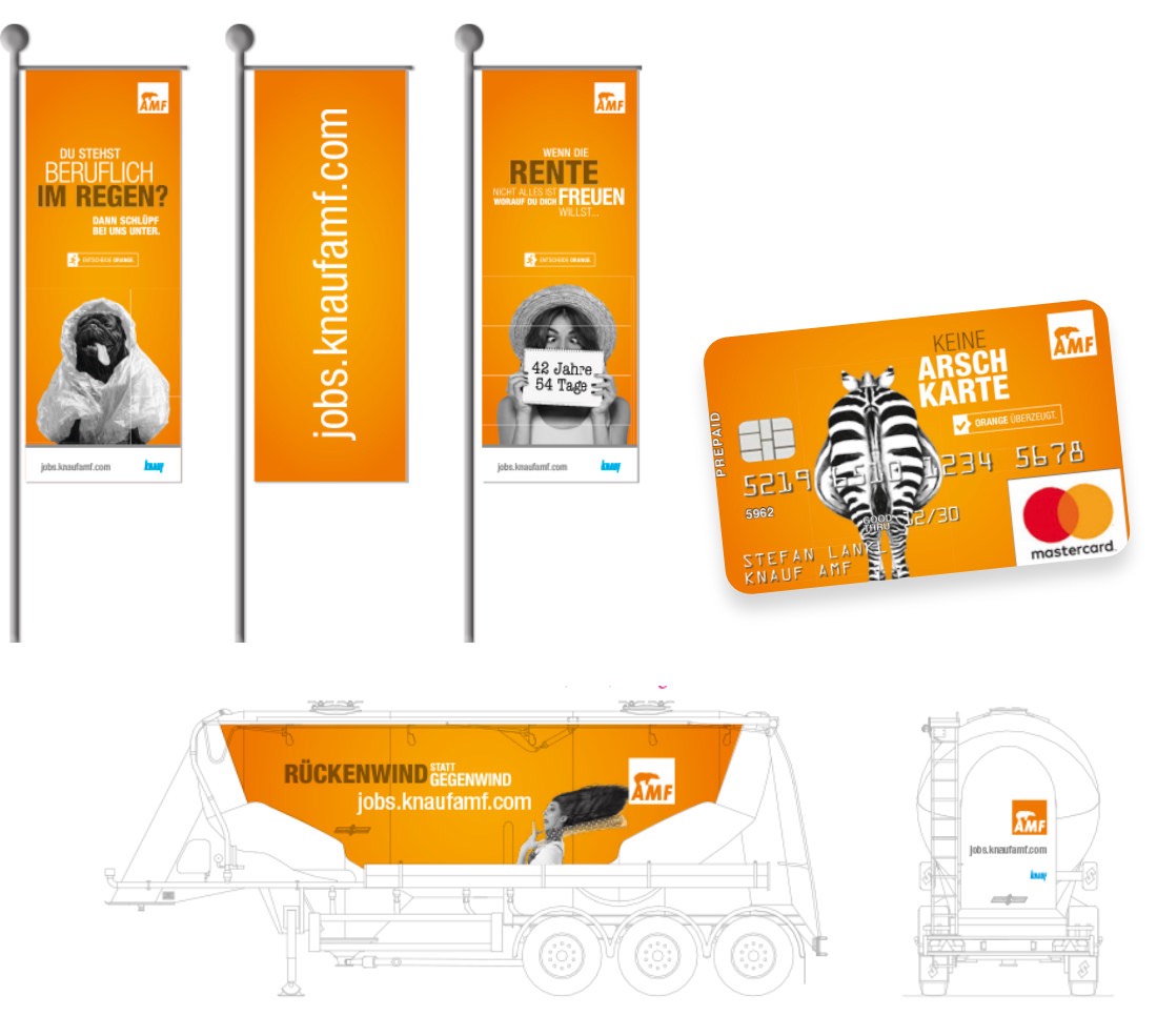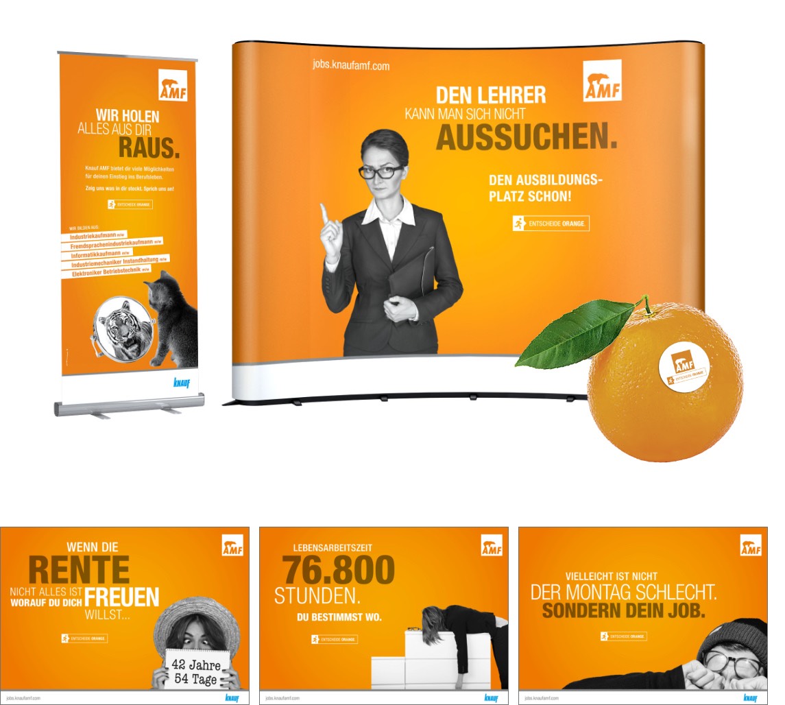 Mit vielen unterhaltsamen Motiven geht Knauf AMF online und offline auf die Suche nach neuen Mitarbeitern. Neben klassischen Anzeigen, Großflächen-Plakaten und Social Web kommen die einzelnen Umsetzungen zielgruppenorientiert auch als Messestände bei Ausbildungsmessen oder als großzügige Bandenwerbung am Sportplatz zum Einsatz. Um potenzielle Mitarbeiter zu erreichen und gleichzeitig das Image zu stärken, konzentrieren sich die Maßnahmen besonders regional um den Firmensitz.