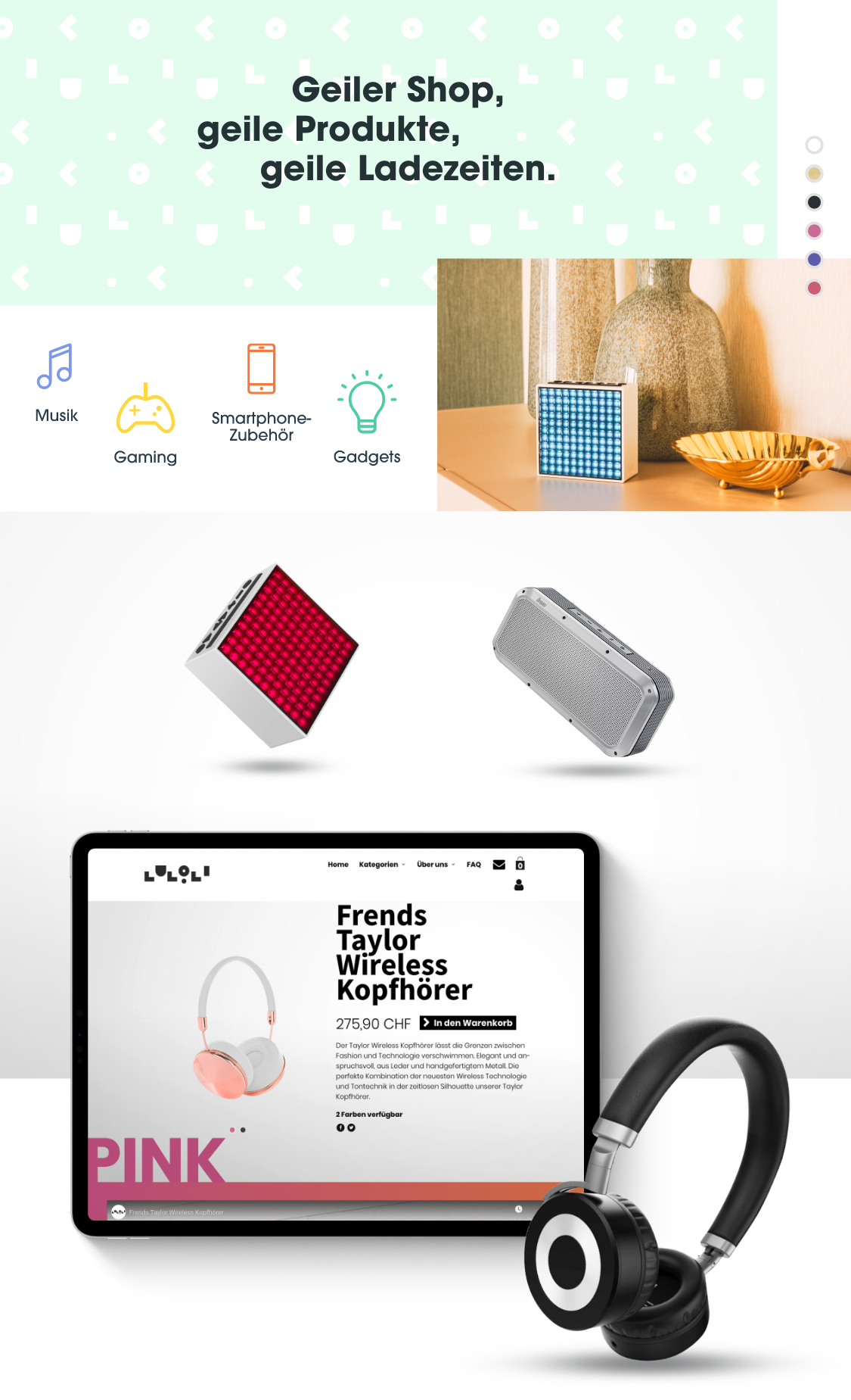 Ein neuer Ansatz, einen Shop zu bauen. Wir haben keine Datenbank im Hintergrund und der Teil, der den Warenkorb und die eigentliche Bestellung steuert, liegt auf einem anderen Server. Dadurch erreichen wir extrem kurze Ladezeiten und eine gute User Experience. Diese wird durch eine normbrechende Gestaltung, die trendige Produkte in ein inspirierendes Umfeld setzt, noch gesteigert. Damit überzeugen wir und unser Kunde aus Liechtenstein auf www.lulo.li